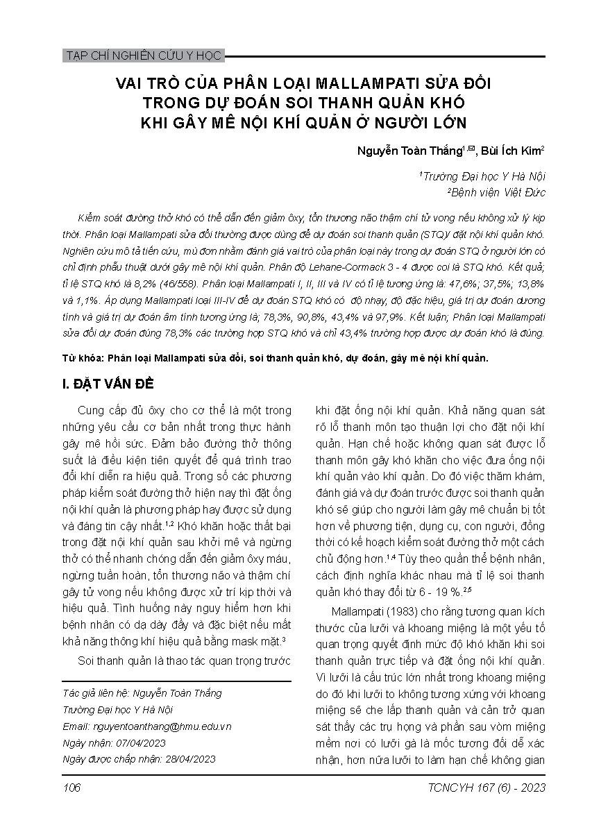 Vai trò của phân loại Mallampati sửa đổi trong dự đoán soi thanh quản khó khi gây mê nội khí quản ở người lớn