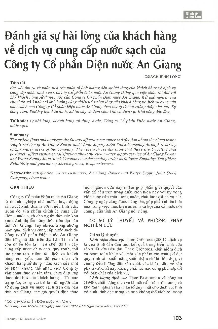 Đánh giá sự hài lòng của khách hàng về dịch vụ cung cấp nước sạch của Công ty Cổ phần Điện nước An Giang