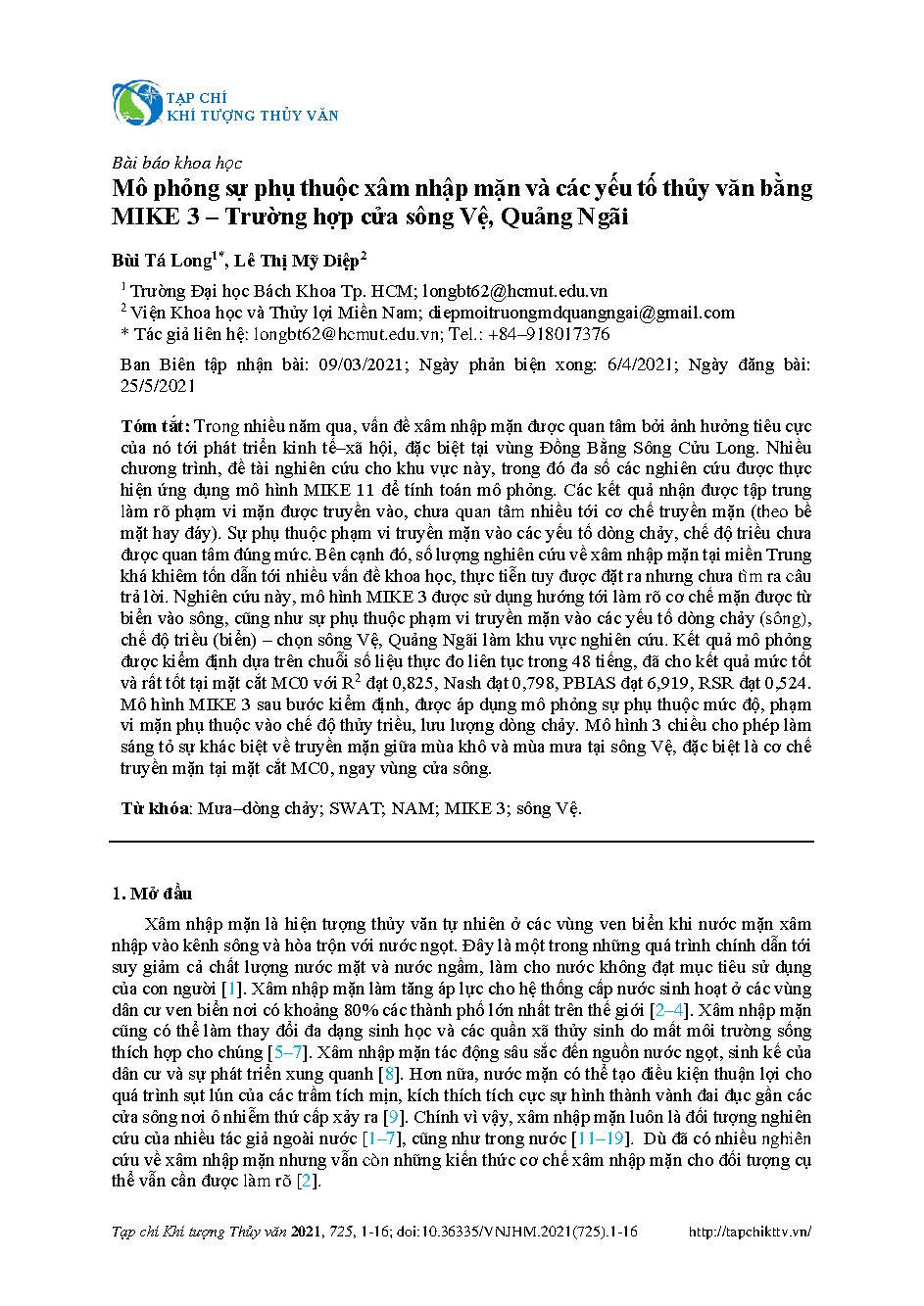 Mô phỏng sự phụ thuộc xâm nhập mặn và các yếu tố thủy văn bằng MIKE 3 – Trường hợp cửa sông Vệ, Quảng Ngãi = Modelling the dependence between salinity intrusion and hydrological factors using MIKE 3: a case study of Ve river, Quang Ngai