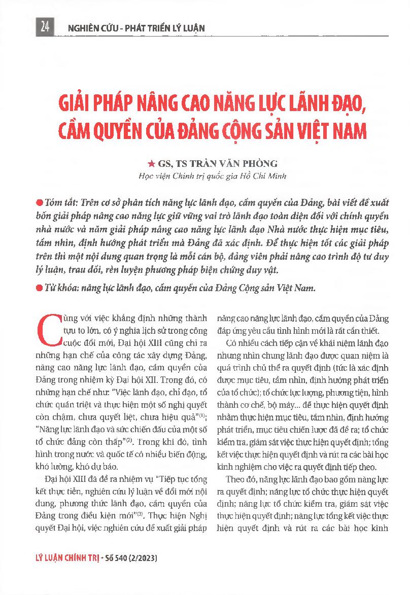 Giải pháp nâng cao năng lực lãnh đạo, cầm quyền của Đảng Cộng sản Việt Nam = Solutions to improve the leadership and ruling capabilities of the Communist Party of Vietnam
