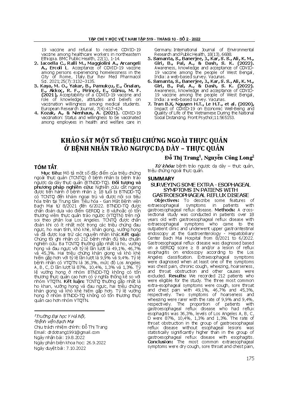 Khảo sát một số triệu chứng ngoài thực quản ở bệnh nhân trào ngược dạ dày – thực quản = Surveying some extra - esophageal symptoms in patients with gastroesophageal reflux disease