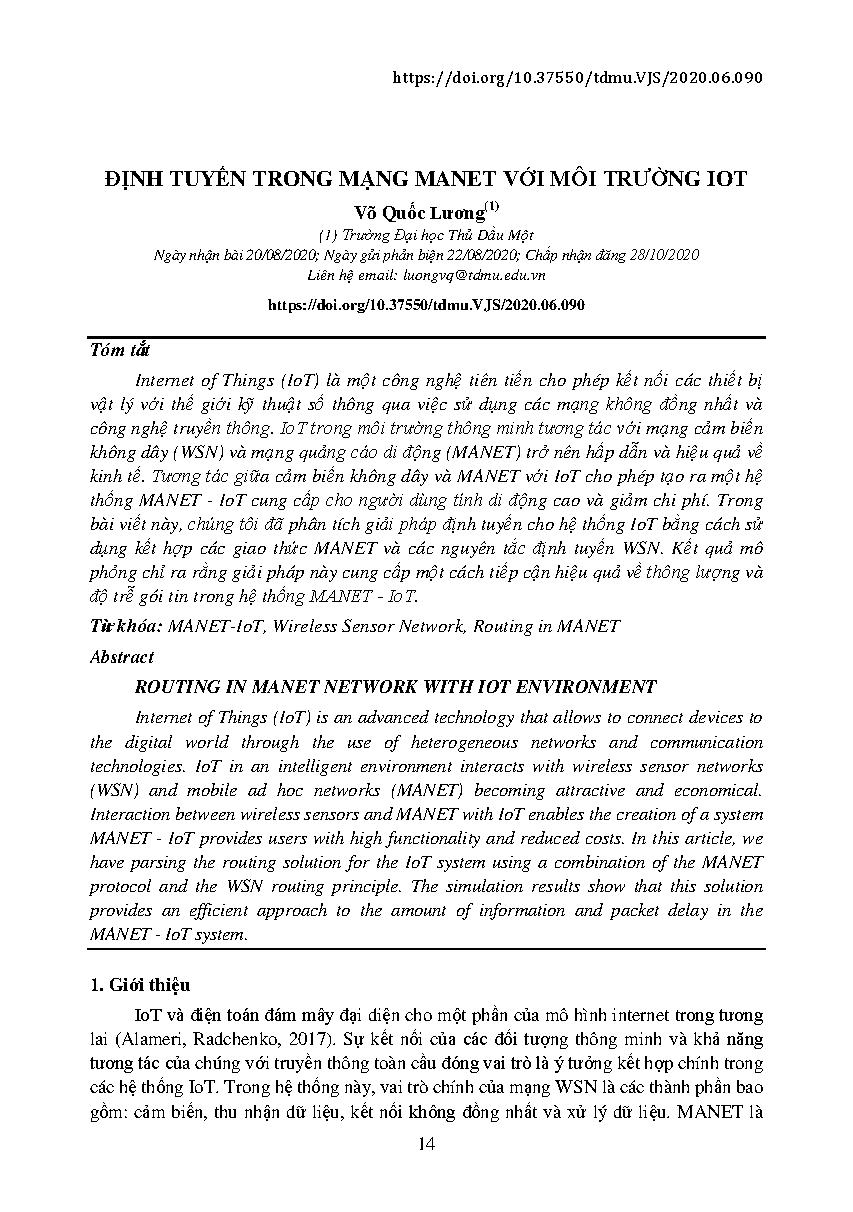 Định tuyến trong mạng MANET với môi trường IoT = Routing in MANET network with IoT environment