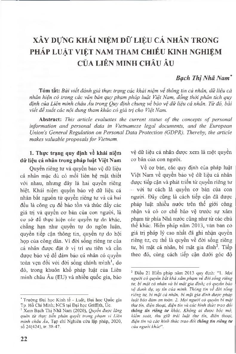 Xây dựng khái niệm dữ liệu cá nhân trong pháp luật Việt Nam tham chiếu kinh nghiệm của Liên minh châu Âu = Conceptualizing Personal Data under Vietnamese Laws with a Reference to the European Union’s Experience