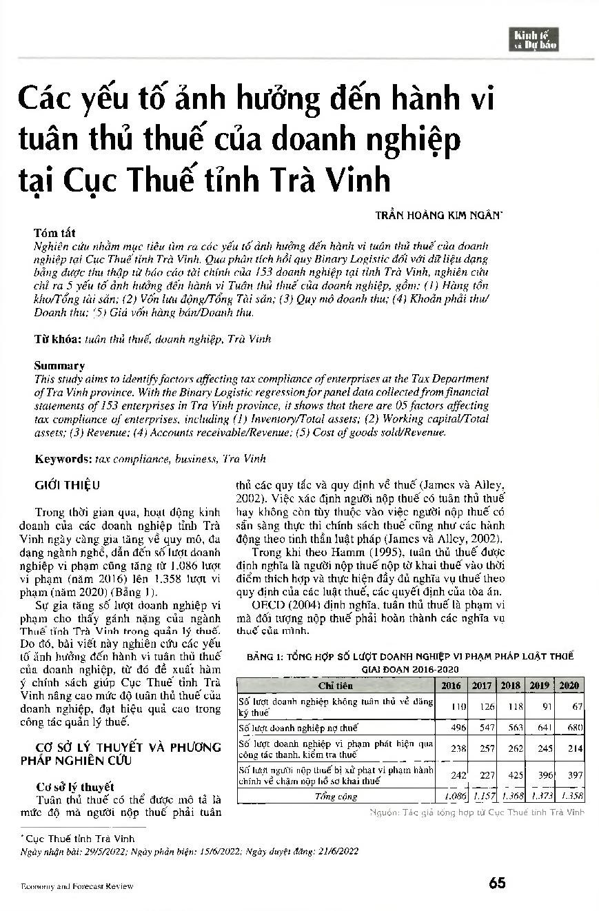 Các yếu tố ảnh hưởng đến hành vi tuân thủ thuế của doanh nghiệp tại Cục Thuế tỉnh Trà Vinh = Factors affecting tax compliance of enterprises at Tax Department of Tra Vinh province