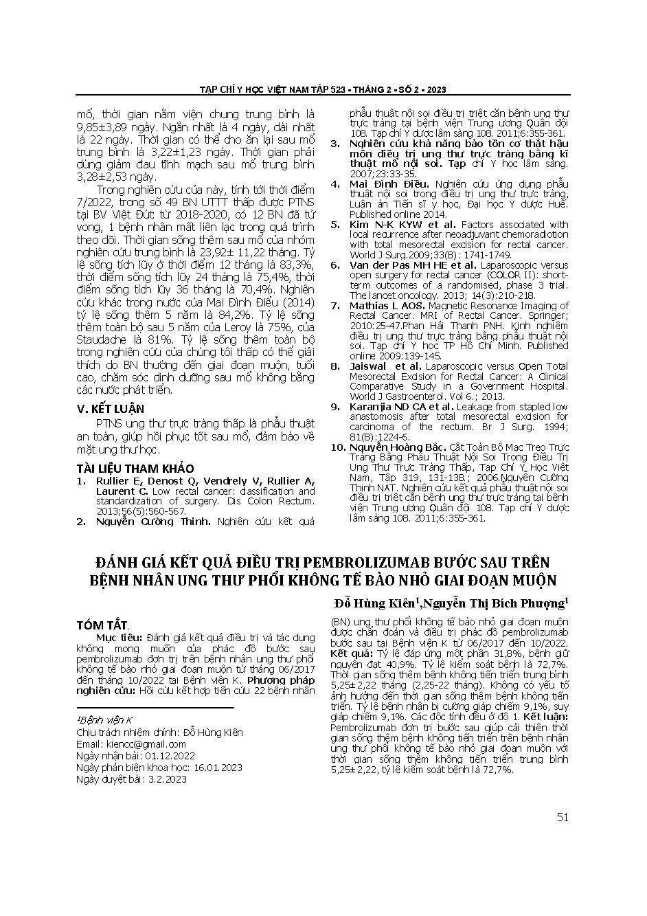 Đánh giá kết quả điều trị pembrolizumab bước sau trên bệnh nhân ung thư phổi không tế bào nhỏ giai đoạn muộn = Assessing treatment results of second-line pembrolizumab for the treatment of recurrent/metastatic non-small cell lung cancer