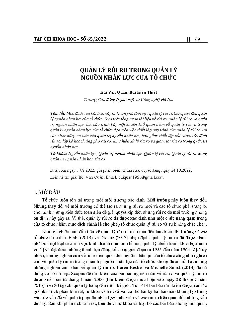 Quản lý rủi ro trong quản lý nguồn nhân lực của tổ chức = Managing the risk of human resources management in an organization