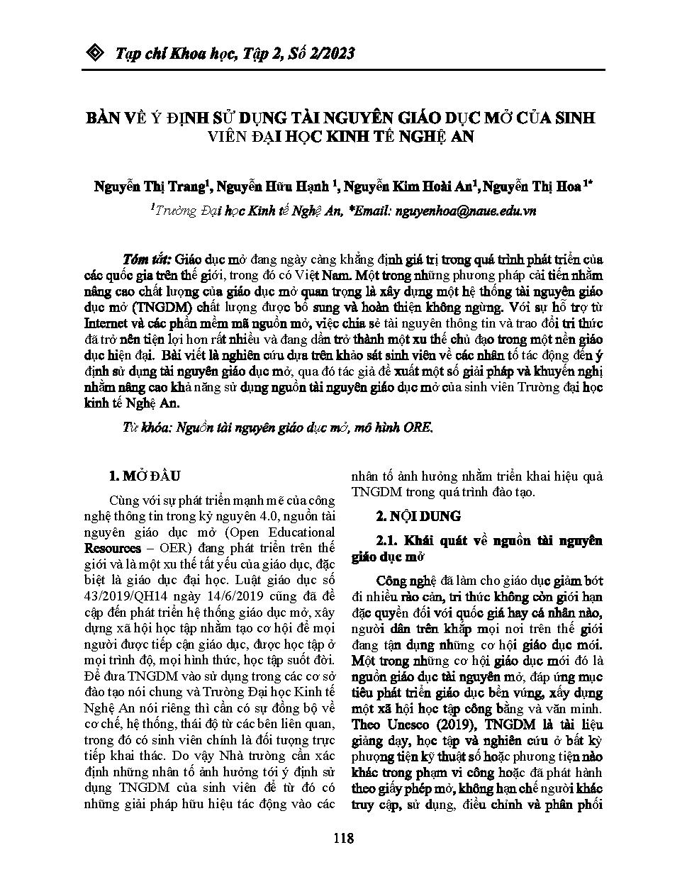 Bàn về ý định sử dụng tài nguyên giáo dục mở của sinh viên Đại học Kinh tế Nghệ An = Talk about intentions to use open educational resources of students of Nghe An University of Economics