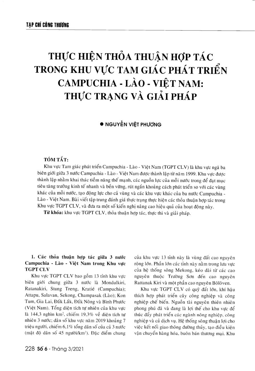 Thực hiện thỏa thuận hợp tác trong khu vực tam giác phát triển Campuchia - Lào - Việt Nam: Thực trạng và giải pháp = The implementation of the CLVDTA's corporation agreements: Current situations and solutions
