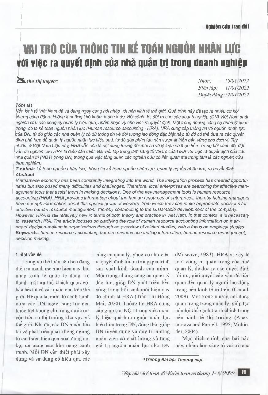 Vai trò của thông tin kế toán nguồn nhân lực với việc ra quyết định của nhà quản trị trong doanh nghiệp = The role of human resource accounting information in the decision - making processes of corporate executive