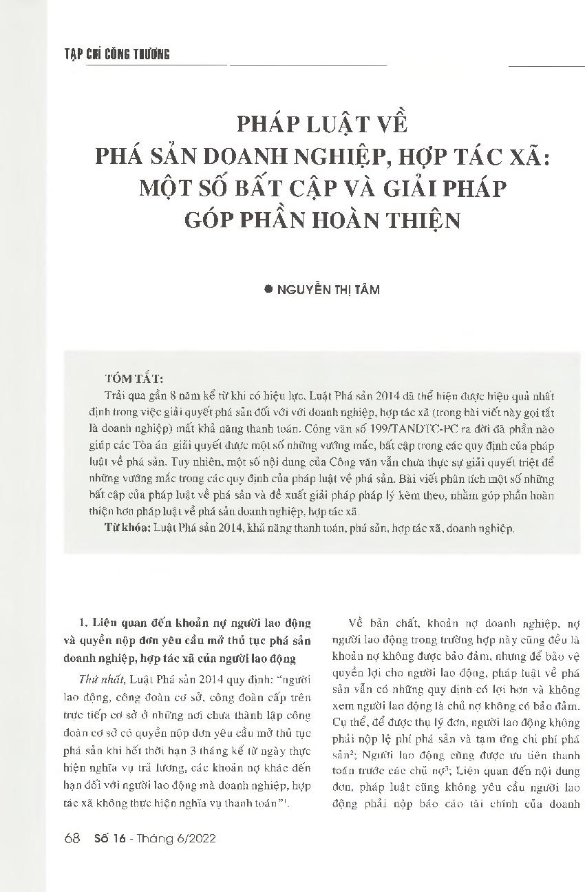 Pháp luật về phá sản doanh nghiệp, hợp tác xã: Một số bất cập và giải pháp góp phần hoàn thiện = Law on the bankruptcy of enterprises and cooperatives: Some inadequacies and solutions