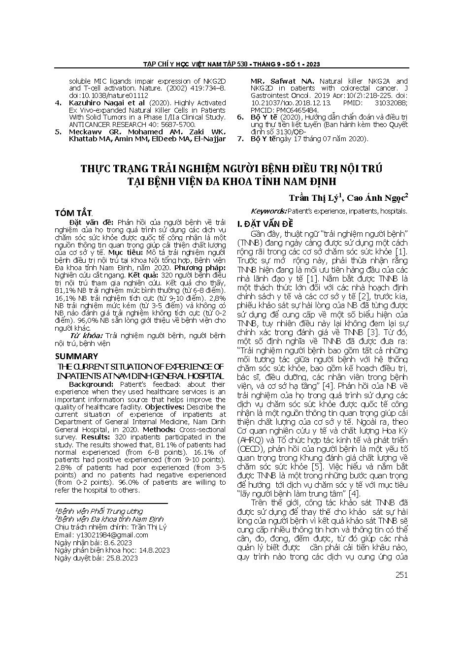 Thực trạng trải nghiệm người bệnh điều trị nội trú tại bệnh viện đa khoa tỉnh nam định = The current situation of experience of inpatients at nam dinh general hospital