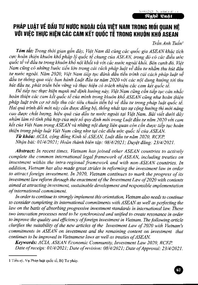 Pháp luật về đầu tư nước ngoài của Việt Nam trong mối quan hệ với việc thực hiện các cam kết quốc tế trong khuôn khổ ASEAN = Vietnam's laws on foreign investment in relation with enforcement of international commitments within ASEAN