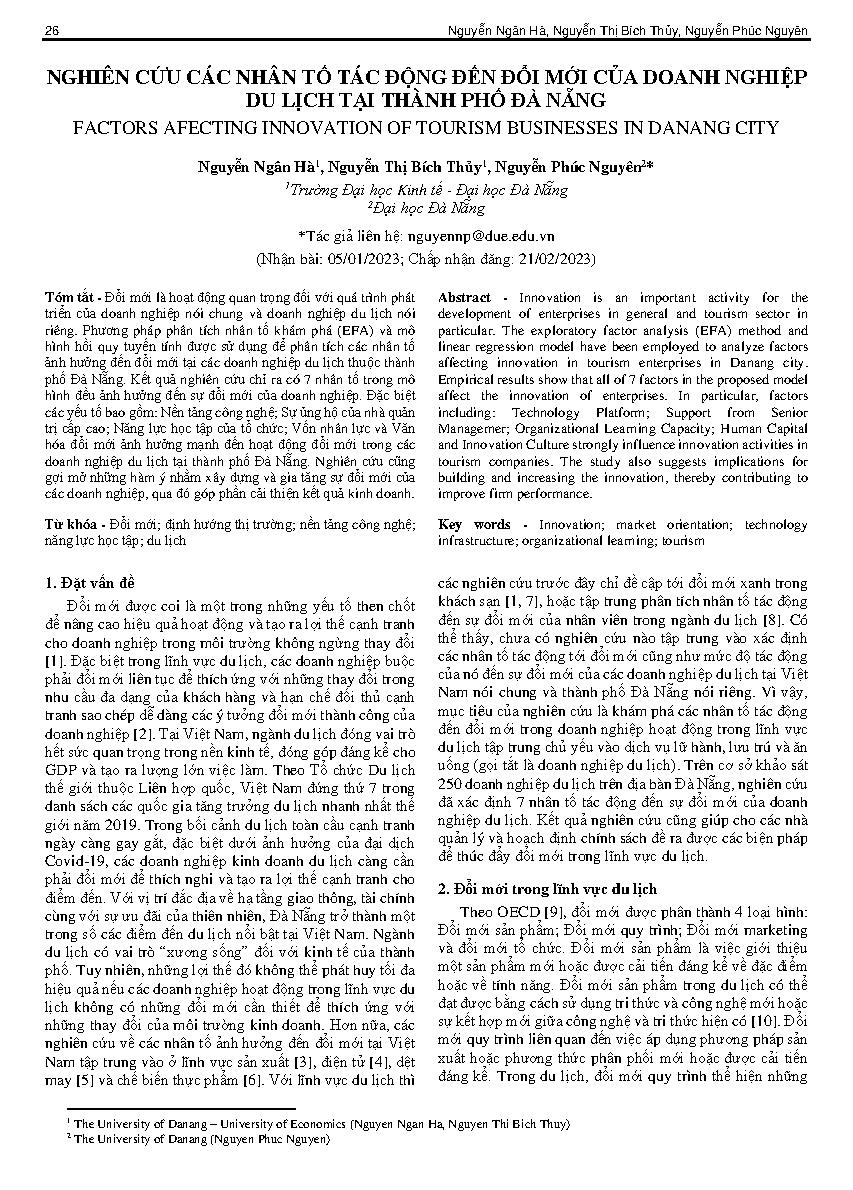 Nghiên cứu các nhân tố tác động đến đổi mới của doanh nghiệp du lịch tại thành phố Đà Nẵng = Factors afecting innovation of tourism businesses in Danang city