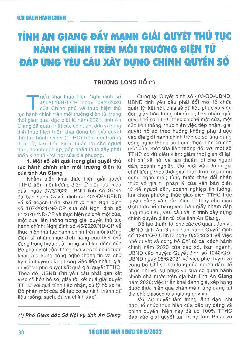 Tỉnh An Giang đẩy mạnh giải quyết thủ tục hành chính trên môi trường điện tử đáp ứng yêu cầu xây dựng chính quyền số = An Giang province promotes the settlement of administrative procedures digitally to meet the requirements of building up an e-government