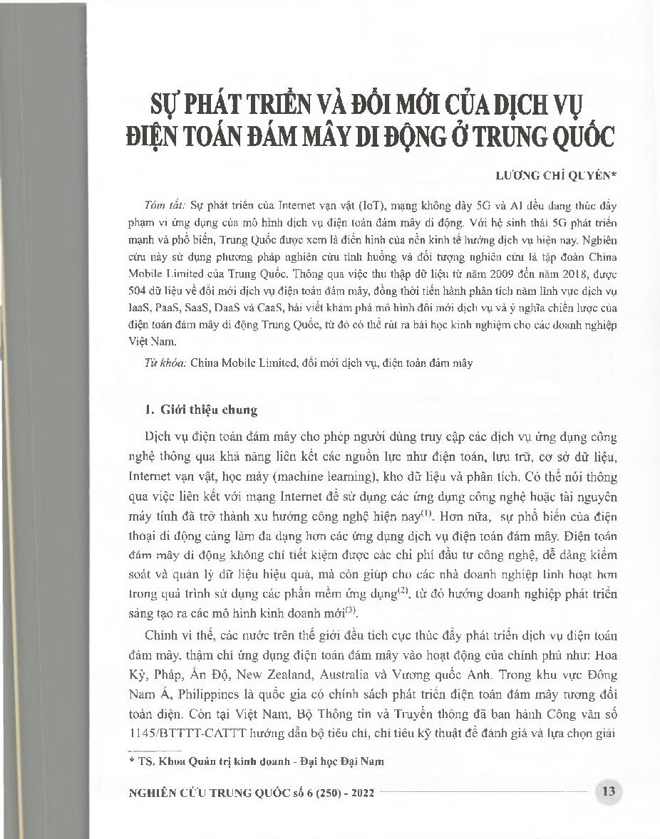 Sự phát triển và đổi mới của dịch vụ điện toán đám mây di động ở Trung Quốc = The development and innovation of mobile cloud computing service in China