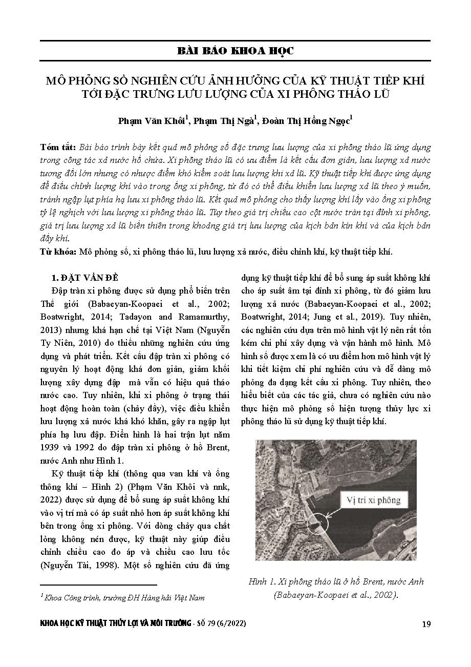Mô phỏng số nghiên cứu ảnh hưởng của kỹ thuật tiếp khí tới đặc trưng lưu lượng của xi phông tháo lũ = Numerical investigation of air vent technique to the outflow Discharge characteristic of siphon spillways