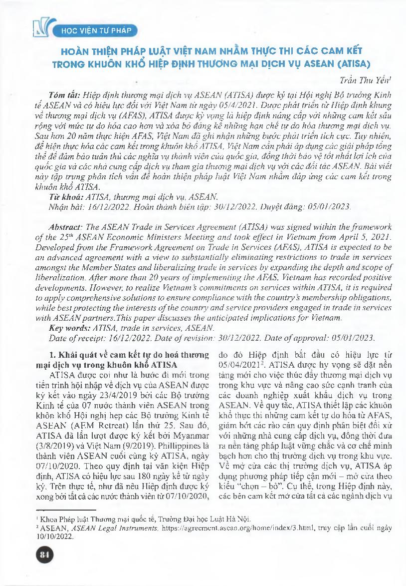 Hoàn thành pháp luật Việt Nam nhằm thực thi các cam kết trong khuôn khổ hiệp định thương mại dịch vụ Asean (ATISA) = Refining Vietnam's law in order to carry out commitments within the ASEAN Trade in Services Agreement (ATISA)