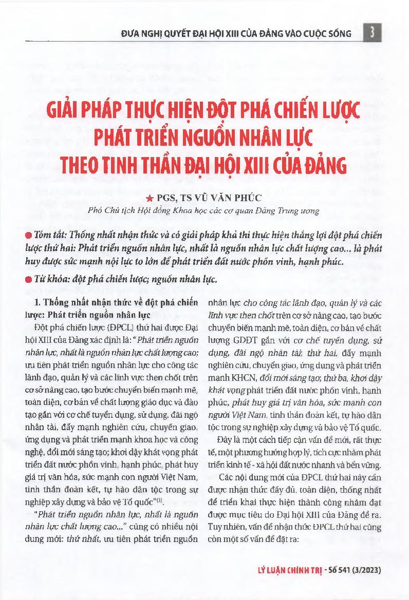 Giải pháp thực hiện đột phá chiến lược phát triển nguồn nhân lực theo tinh thần Đại hội XIII của Đảng = Solutions to implement the strategic breakthroughs of human resource development in the spirit of the 13th Party Congress