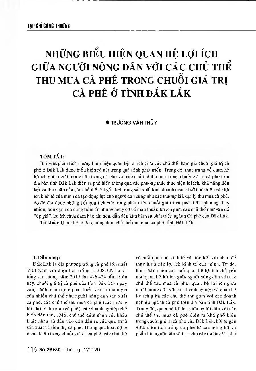 Những biểu hiện quan hệ lợi ích giữa người nông dân với các chủ thể thu mua cà phê trong chuỗi giá trị cà phê ở tỉnh Đắk Lắk = The interest relations between coffee growers and buyers in the coffee value chain in Dak Lak Province