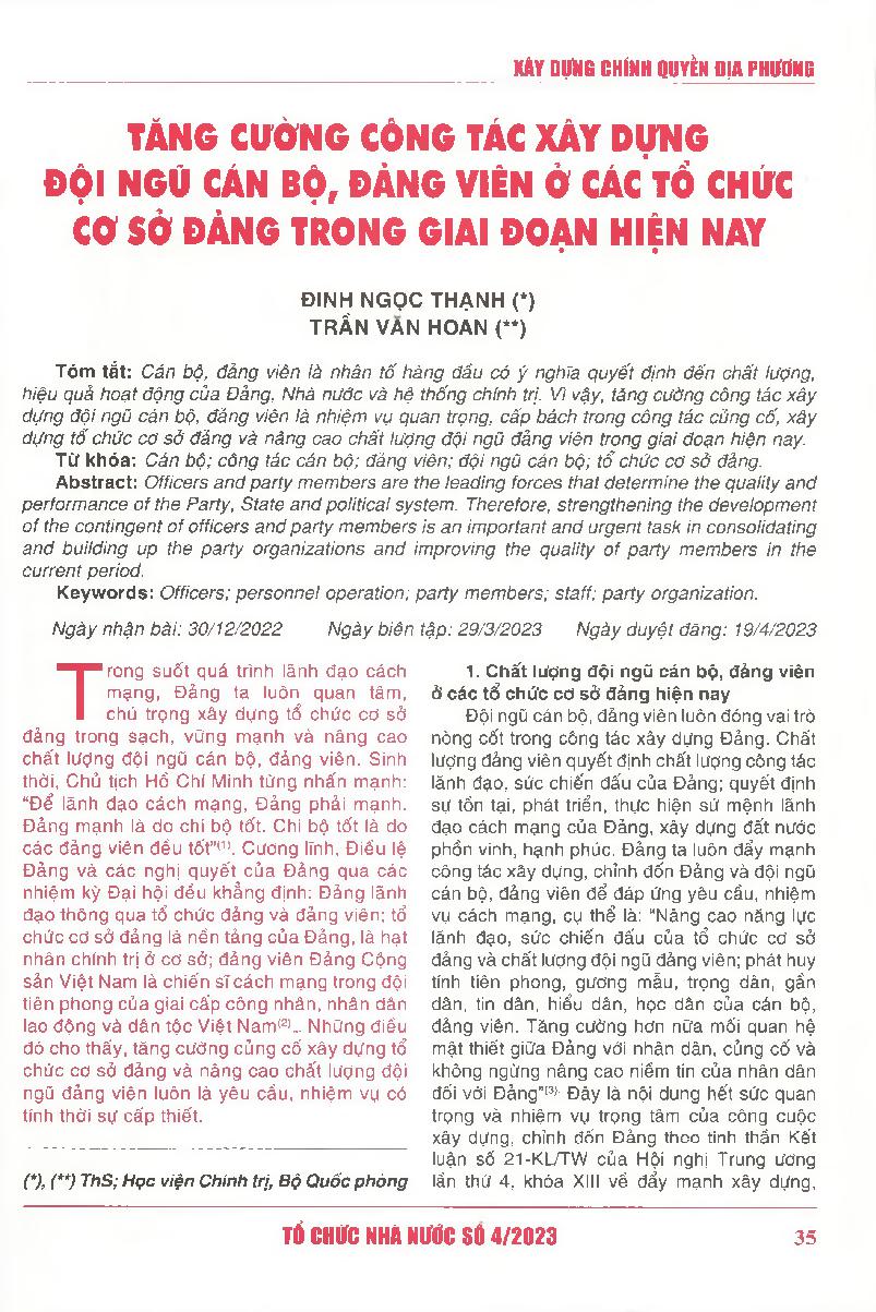 Tăng cường công tác xây dựng đội ngũ cán bộ, đảng viên ở các tổ chức cơ sở đảng trong giai đoạn hiện nay = Strengthening the development of the contingent of officers and party members at grassroots-level party organizations in the current period