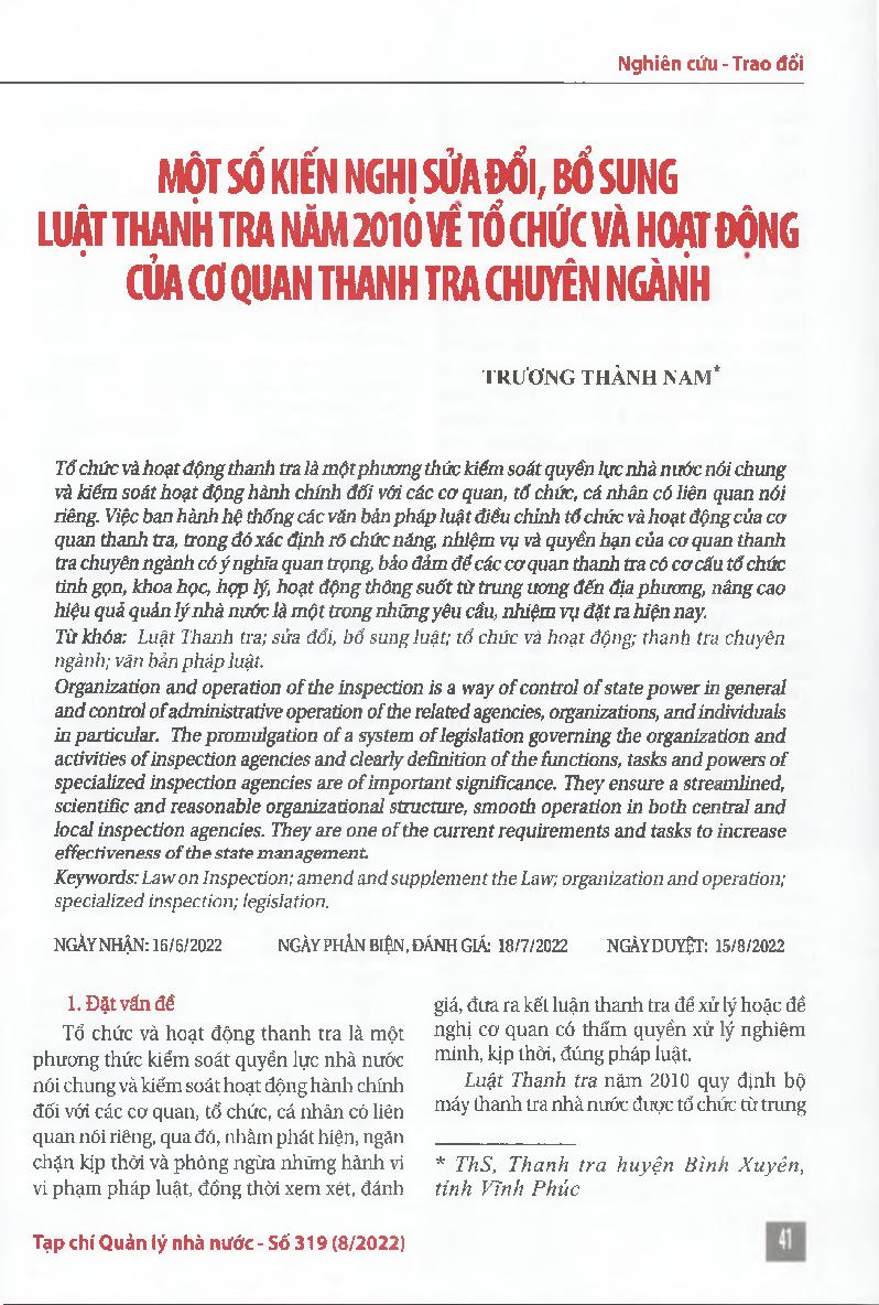 Một số kiến nghị sửa đổi, bổ sung luật thanh tra năm 2010 về tổ chức và hoạt đông của cơ quan thanh tra chuyên ngành = Some recommendations to amend and supplement the 2010 Law on Inspection concerning the organization and operation of the specialized ins