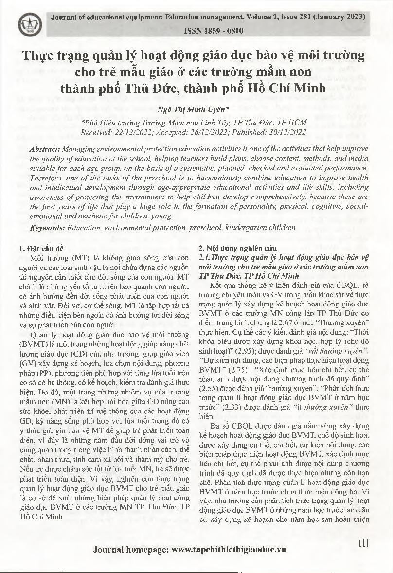Thực trạng quản lý hoạt động giáo dục bảo vệ môi trường cho trẻ mẫu giáo ở các trường mầm non thành phố Thủ Đức, thành phố Hồ Chí Minh = Current situation of environmental protection education management for children in preschools in Thu Duc City, Ho Chi