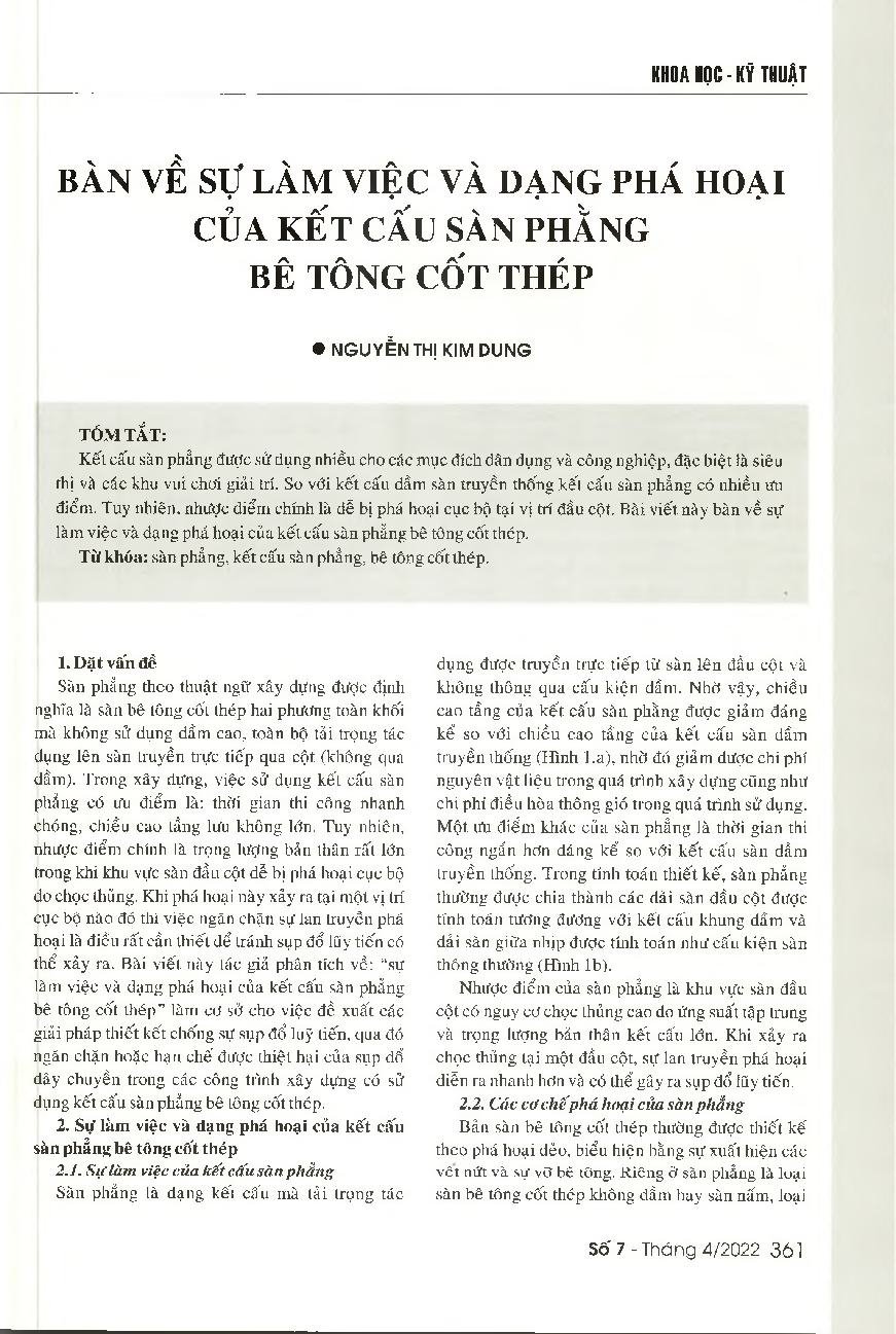 Bàn về sự làm việc và dạng phá hoại của kết cấu sản phẩm sàn phẳng bê tông cốt thép = The performance and the failure modes of reinforced concrete flat slab structure