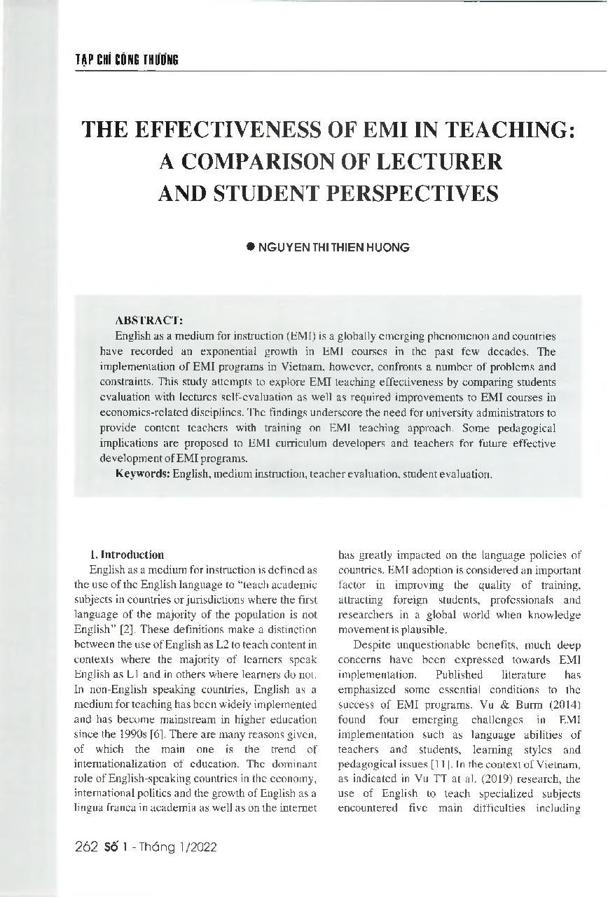 Hiệu quả của việc áp dụng phương pháp EMI trong việc giảng dạy nội dung môn học: So sánh giữa quan điểm của giảng viên và sinh viên = The effectiveness of EMI in teaching: A comparison of lecturer and student perspectives