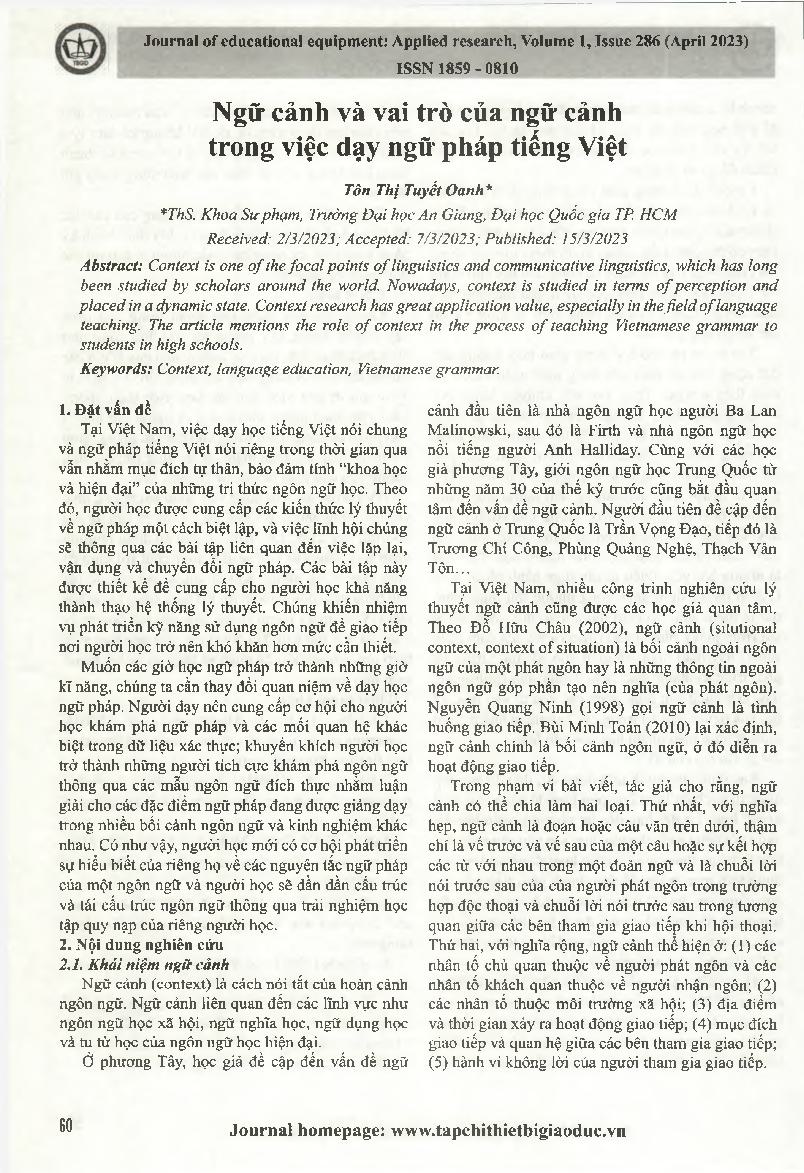 Ngữ cảnh và vai trò của ngữ cảnh trong việc dạy ngữ pháp tiếng Việt = Context and the role of context in teaching Vietnamese grammar.