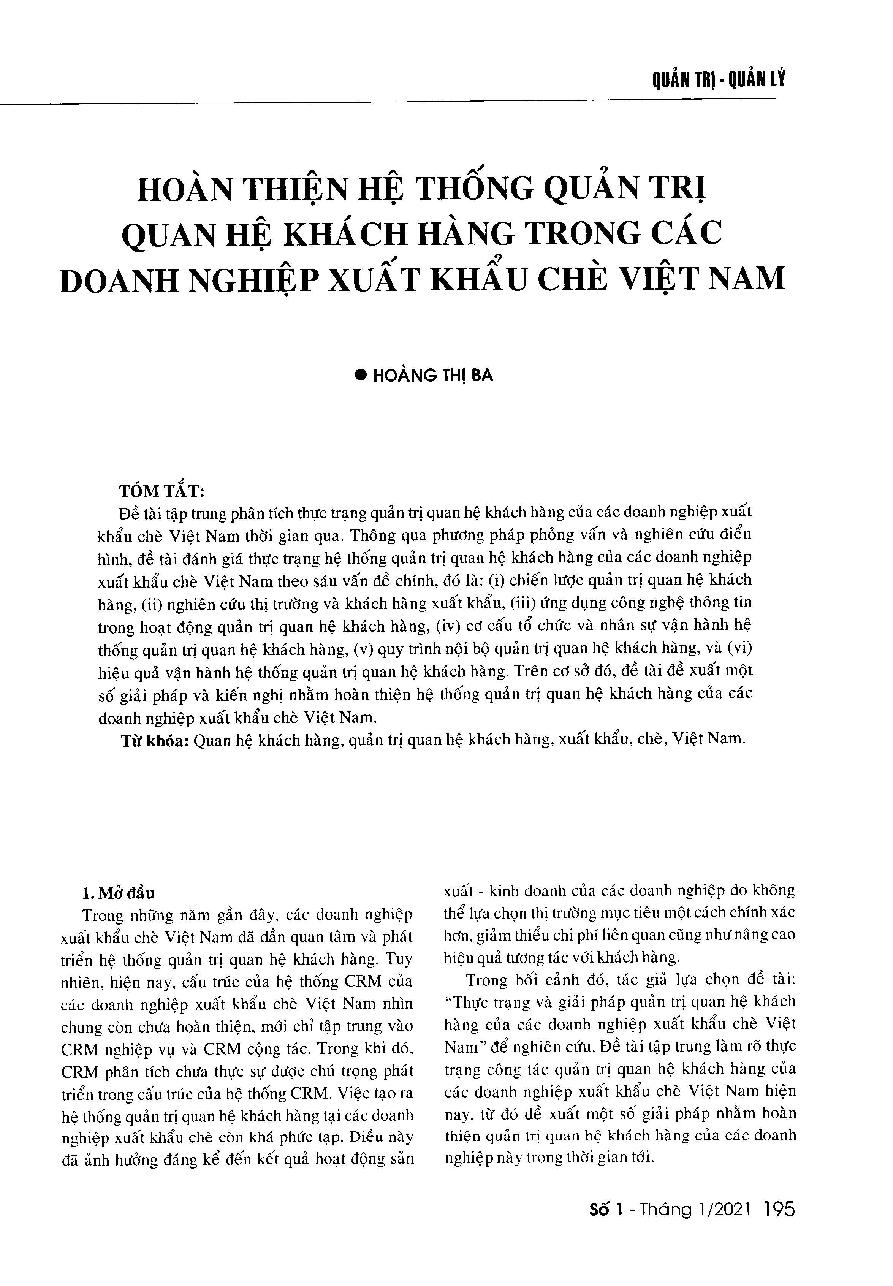 Hoàn thiện hệ thống quản trị quan hệ khách hàng trong các doanh nghiệp xuất khẩu chè Việt Nam = Perfecting the customer relationship management system of Vietnamese tea exporting enterprises