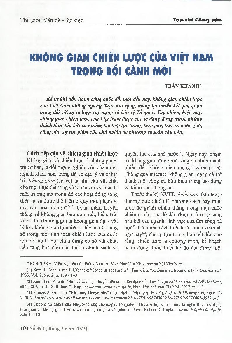 Không gian chiến lược của Việt Nam trong bối cảnh mới = Vietnam&; 39;s strategic space in the new context