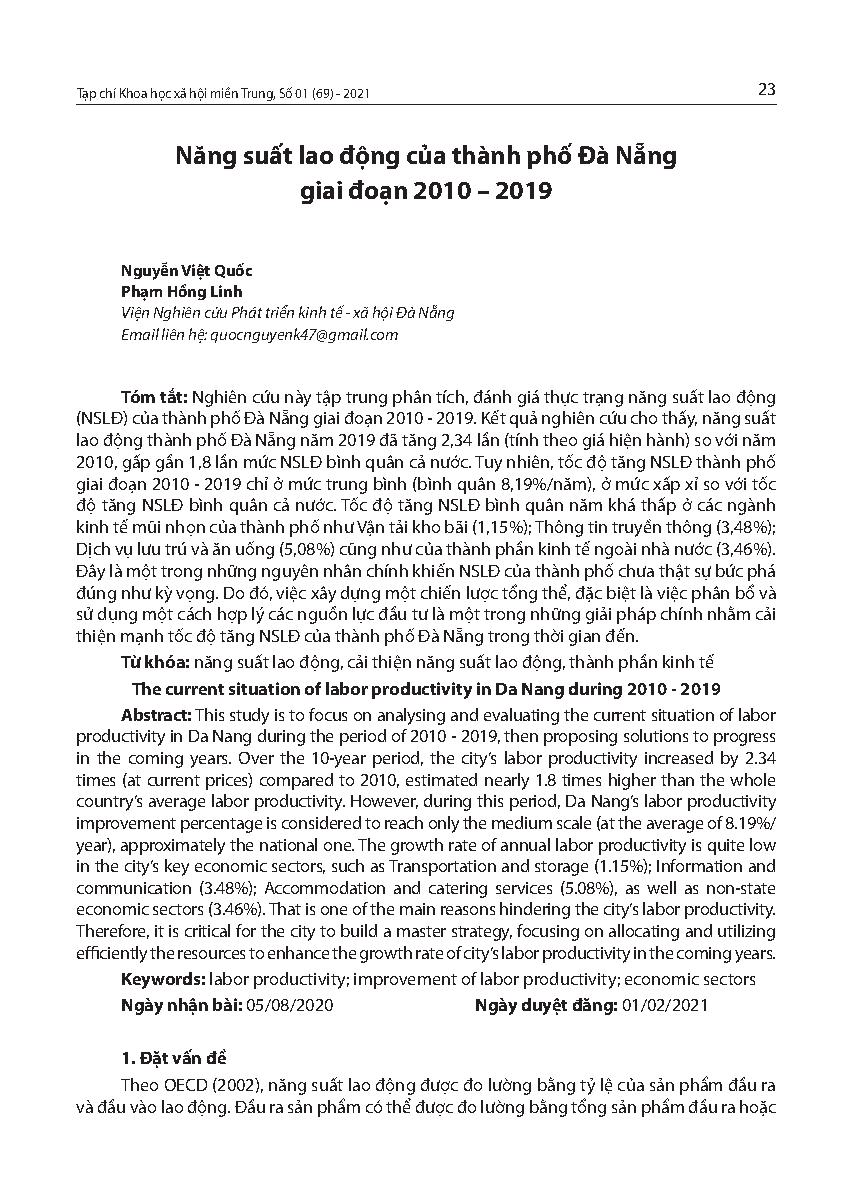 Năng suất lao động của thành phố Đà Nẵng giai đoạn 2010 – 2019 = The current situation of labor productivity in Da Nang during 2010 - 2019