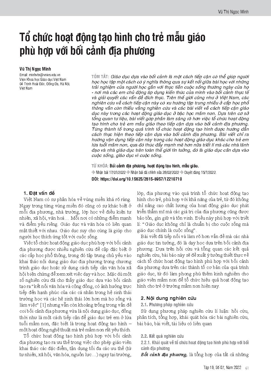Tổ chức hoạt động tạo hình cho trẻ mẫu giáo phù hợp với bối cảnh địa phương = Organizing visual art activities for preschool children based on the local context
