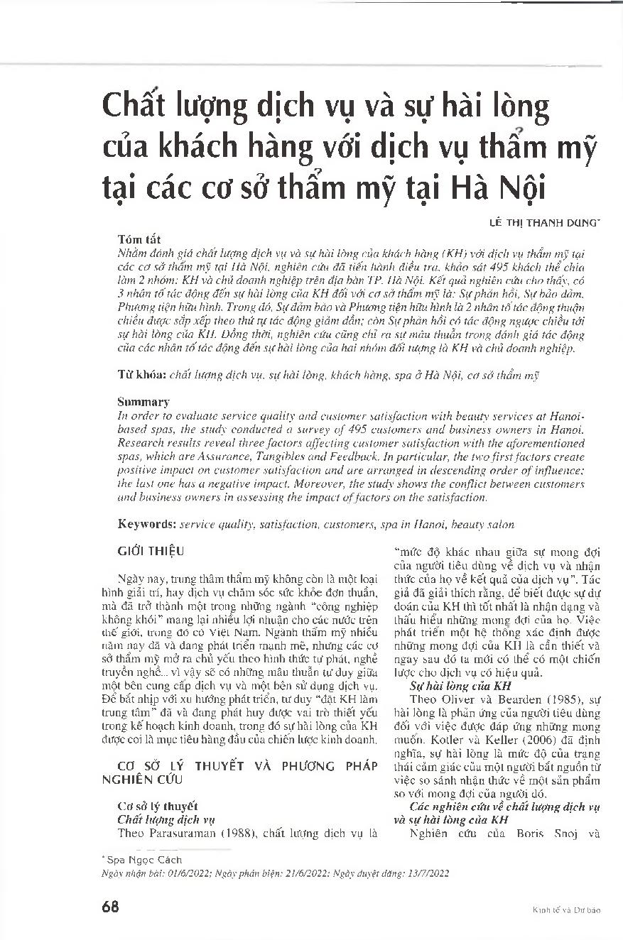 Chất lượng dịch vụ và sự hài lòng của khách hàng với dịch vụ thẩm mỹ tại các cơ sở thẩm mỹ tại Hà Nội = Service quality and customer satisfaction with beauty services at beauty salons in Hanoi-based spas
