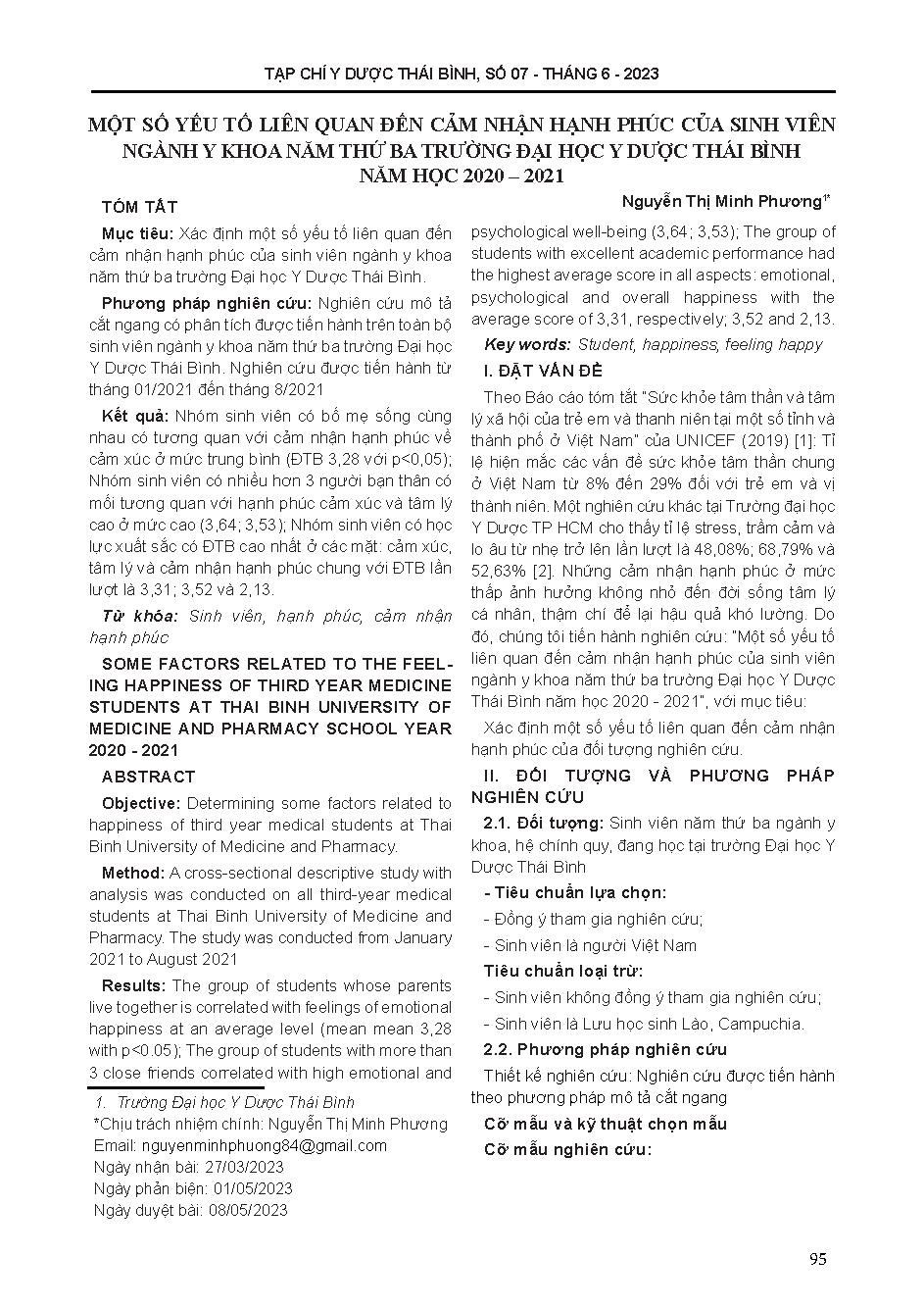 Một số yếu tố liên quan đến cảm nhận hạnh phúc của sinh viên ngành Y khoa năm thứ ba Trường Đại học Y Dược Thái Bình năm học 2020 - 2021
