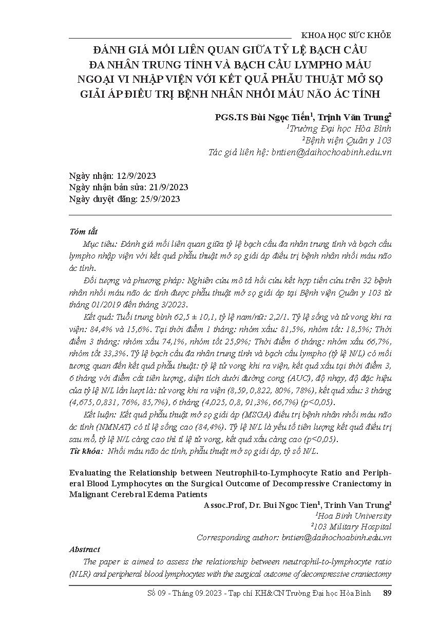 Đánh giá mối liên quan giữa tỷ lệ bạch cầu đa nhân trung tính và bạch cầu lympho máu ngoại vi nhập viện với kết quả phẫu thuật mở sọ giải áp điều trị bệnh nhân nhồi máu não ác tính = Evaluating the relationship between neutrophil-to-Lymphocyte ratio and p