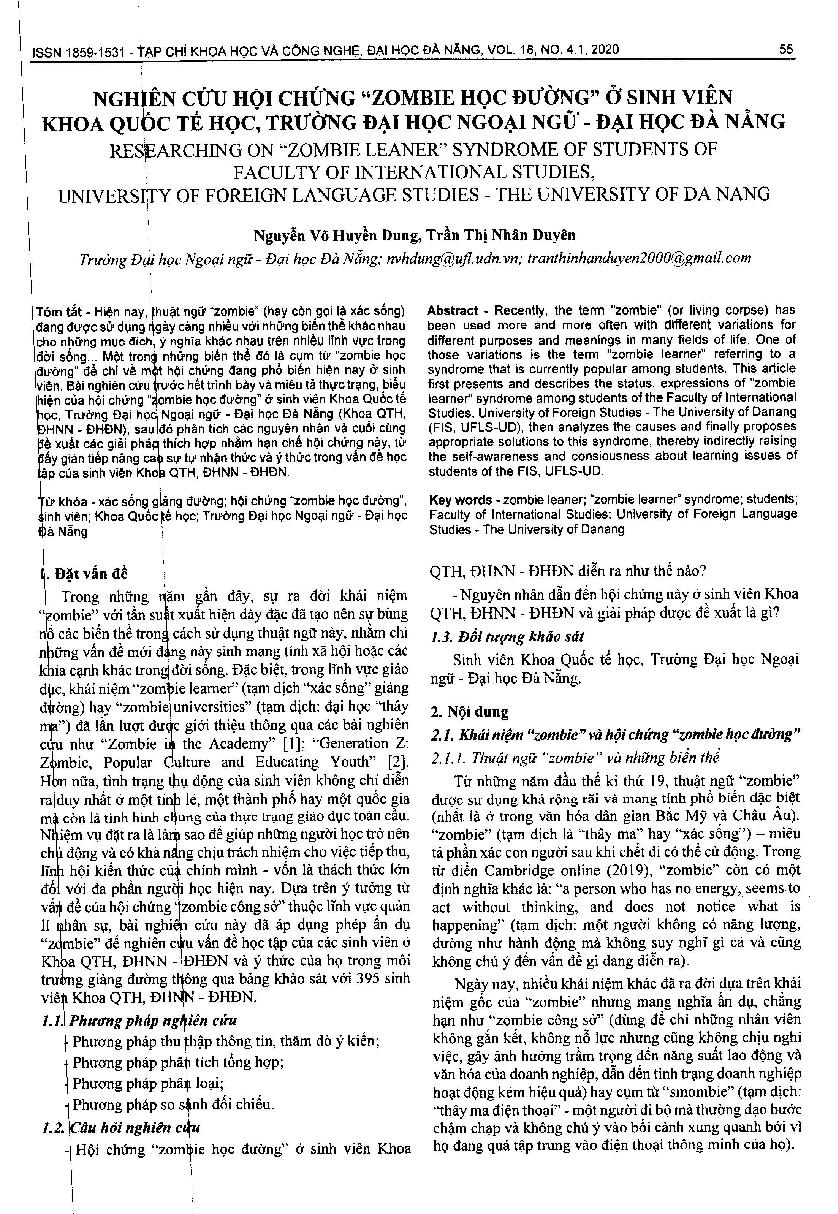 Nghiên cứu hội chứng “zombie học đường” ở sinh viên khoa quốc tế học, Trường Đại học Ngoại ngữ - Đại học Đà Nẵng = Researching on “zombie leaner” syndrome of students of faculty of international studies, university of foreign language studies - the university of Danang