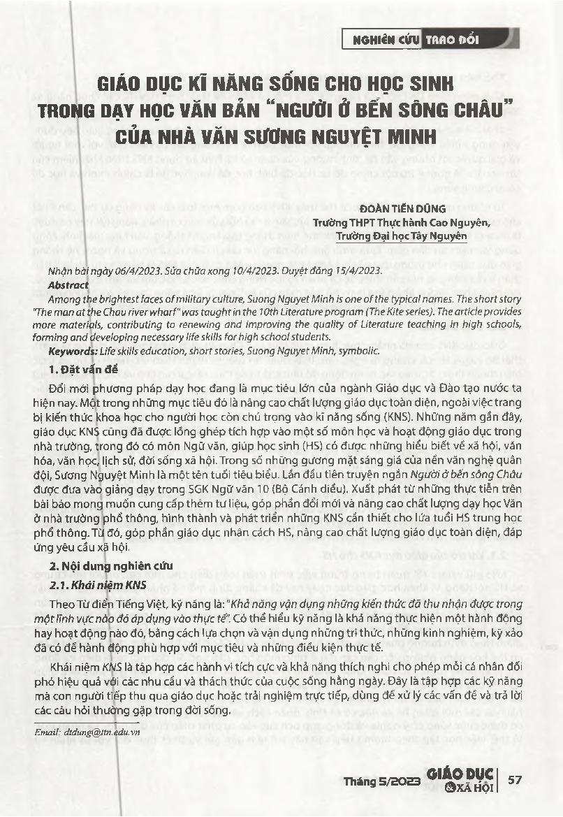 Giáo dục kĩ năng sống cho học sinh trong dạy học văn bản "Người ở bến sông Châu" của nhà văn Sương Nguyệt Minh = Education of life skills for 127 students through teaching short story "The man at the Chau river wharf" by writer Suong Nguyet Minh.