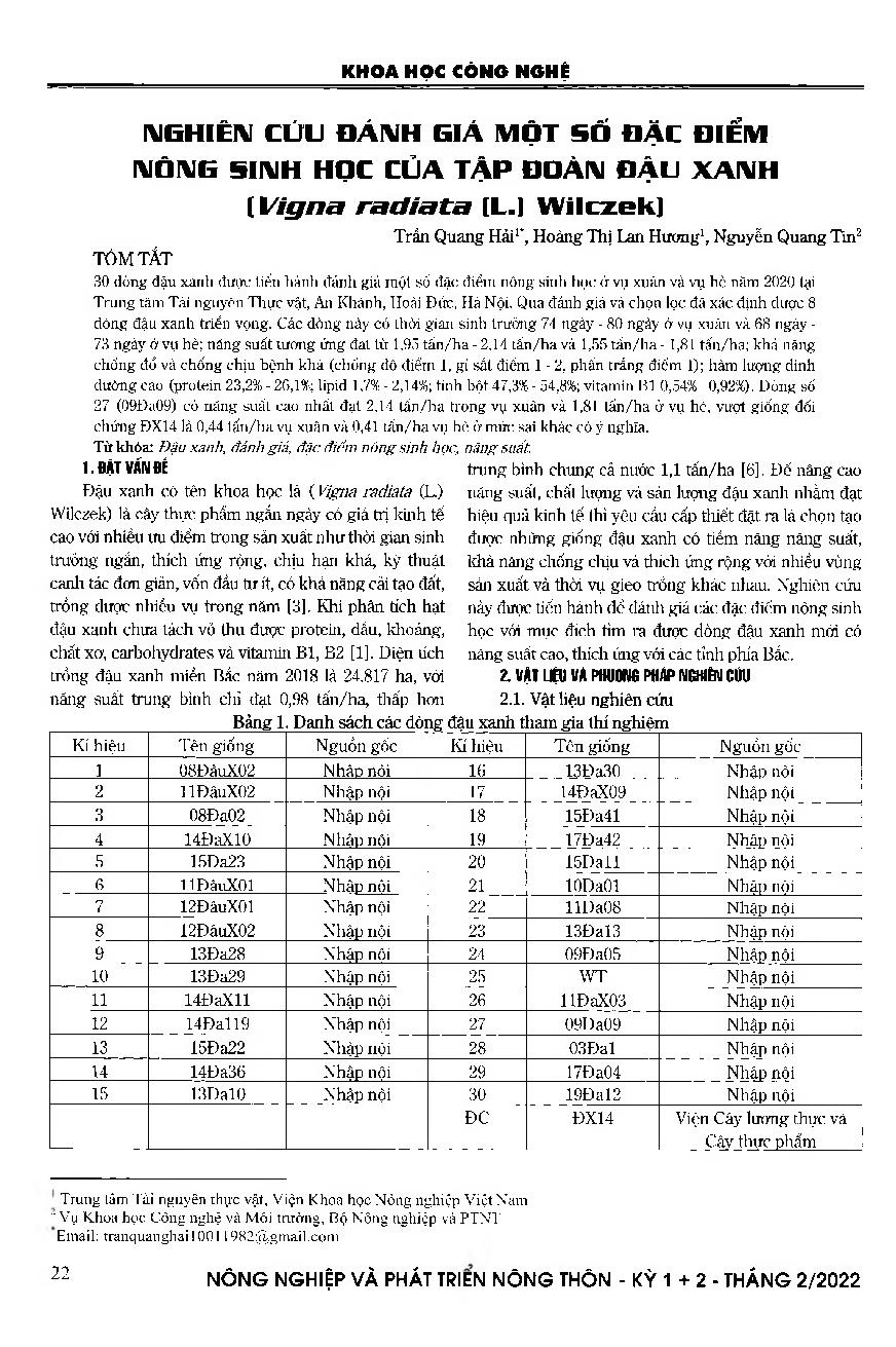 Nghiên cứu đánh giá một số đặc điểm nông sinh học của tập đoàn đậu xanh (Vigna radiata [L.] Wilczek] = Research on some agro - biological characteristics of mungbean resources