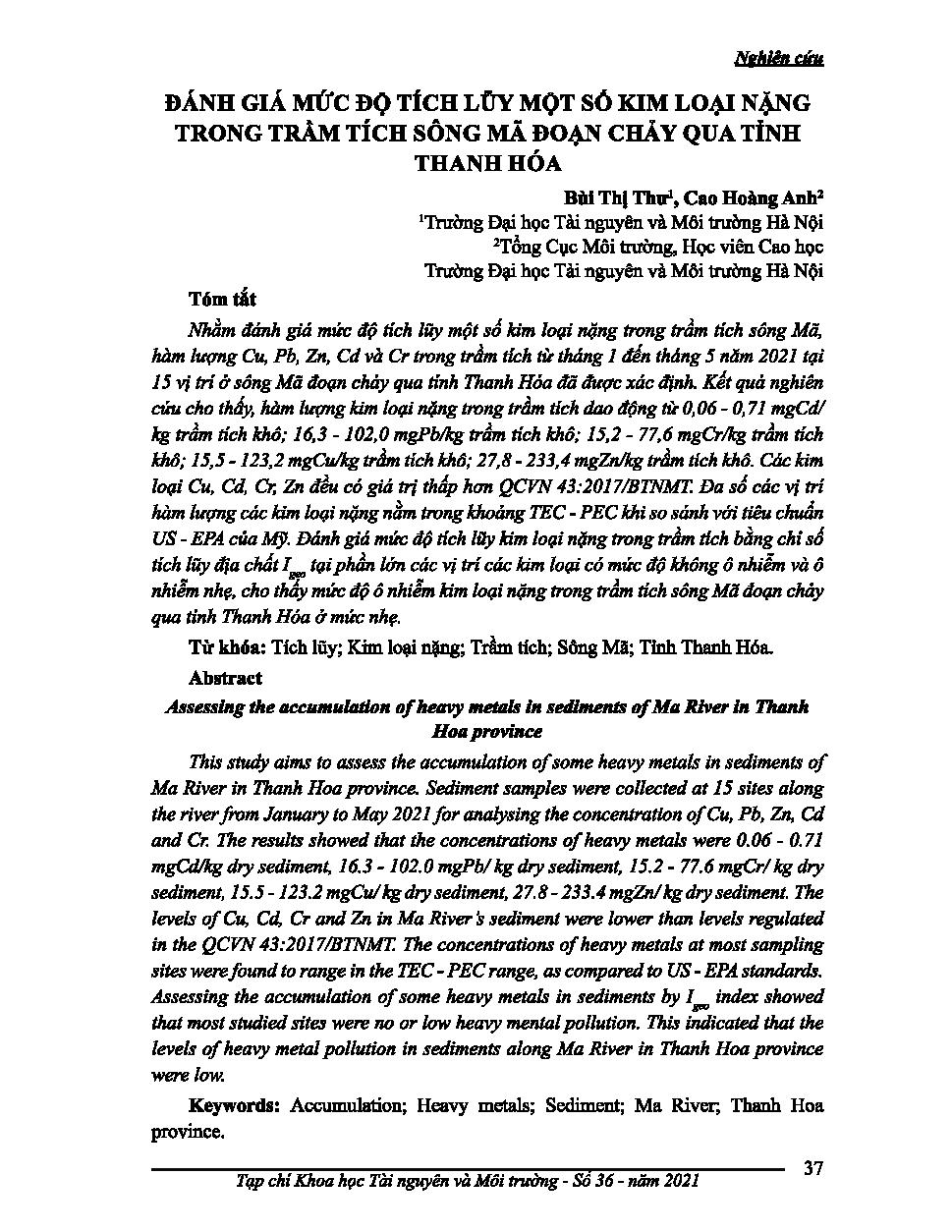 Đánh giá mức độ tích lũy một số kim loại nặng trong trầm tích sông Mã đoạn chảy qua tỉnh Thanh Hóa = Assessing the accumulation of heavy metals in sediments of Ma River in Thanh Hoa province