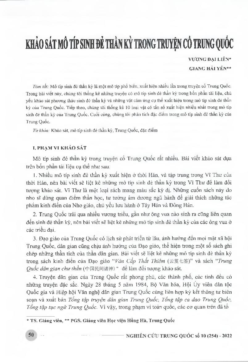 Khảo sát mô tip sinh đẻ thần kỳ trong truyện cổ Trung Quốc = Survey on the motif of miraculous parturition in Chinese fairy tales