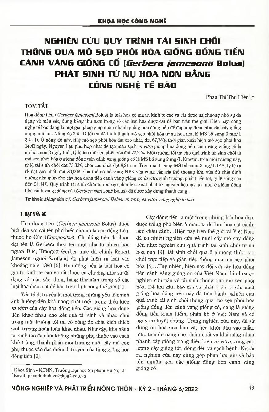Nghiên cứu quy trình tái sinh chồi thông qua mô sẹo phôi hóa giống đồng tiền cánh vàng giống cổ (Gerbera jamesonii Bolus) phát sinh từ nụ hoa non bằng công nghệ tế bào = Research on the process of multi -microparagation regeneration through embryogenic ca