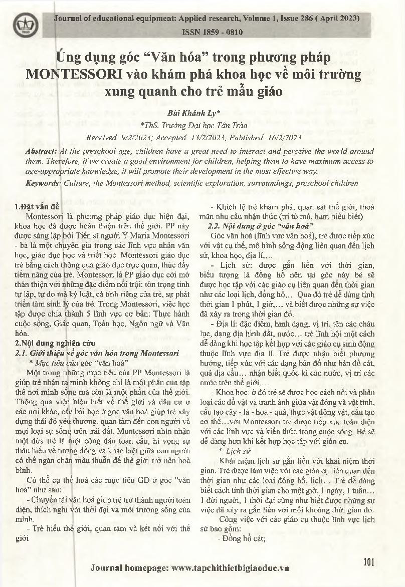 Úng dụng góc "Văn hóa" trong phương pháp MONTESSORI vào khám phá khoa học về môi trường xung quanh cho trẻ mẫu giáo = Applying the "Culture " angle in the MONTESSOR method to scientific exploration of the surrounding environment for preschool children.