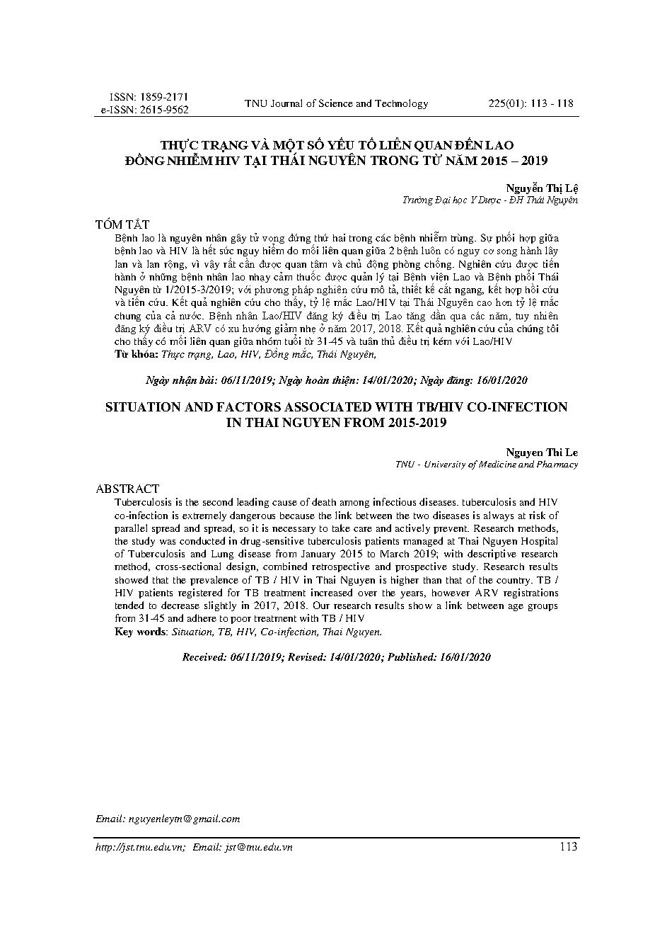 THỰC TRẠNG VÀ MỘT SỐ YẾU TỐ LIÊN QUAN ĐẾN LAO ĐỒNG NHIỄM HIV TẠI THÁI NGUYÊN TRONG TỪ NĂM 2015 – 2019 = SITUATION AND FACTORS ASSOCIATED WITH TB/HIV CO-INFECTION IN THAI NGUYEN FROM 2015-2019