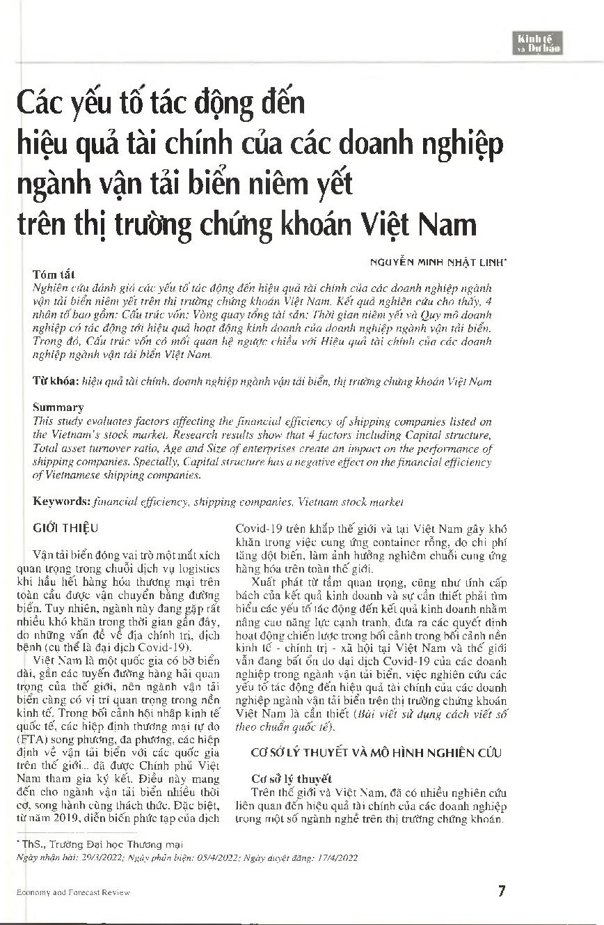 Các yếu tố tác động đến hiệu quả tài chính của các doanh nghiệp ngành vận tải biển niêm yết trên thị trường chứng khoán Việt Nam = Factors affecting the financial efficiency of shipping companies listed on the Vietnam’s stock market