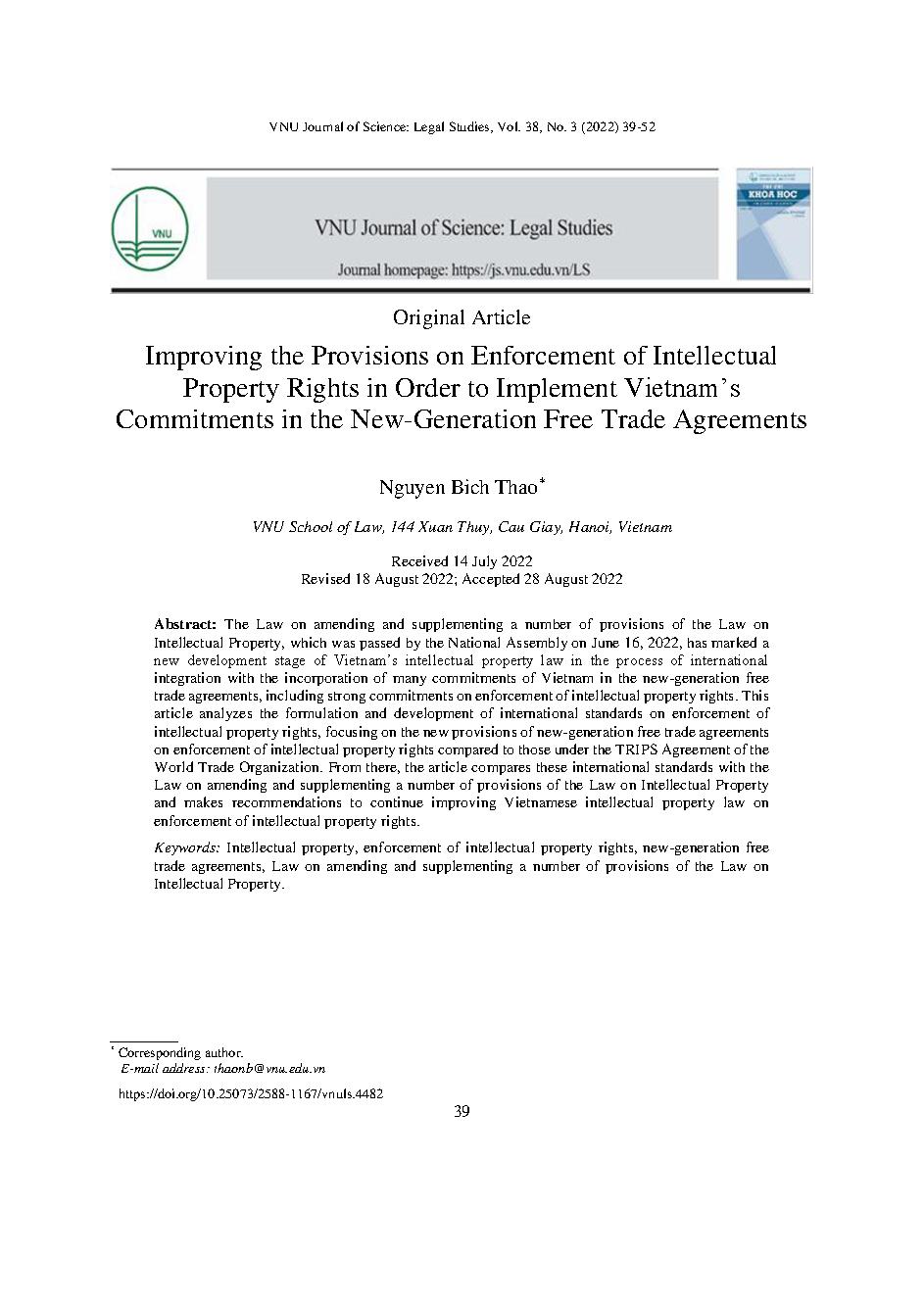 Hoàn thiện các quy định về bảo vệ quyền sở hữu trí tuệ nhằm thực thi cam kết của Việt Nam trong các hiệp định thương mại tự do thế hệ mới = Improving the provisions on enforcement of intellectual property rights in order to implement Vietnam’s Commitments