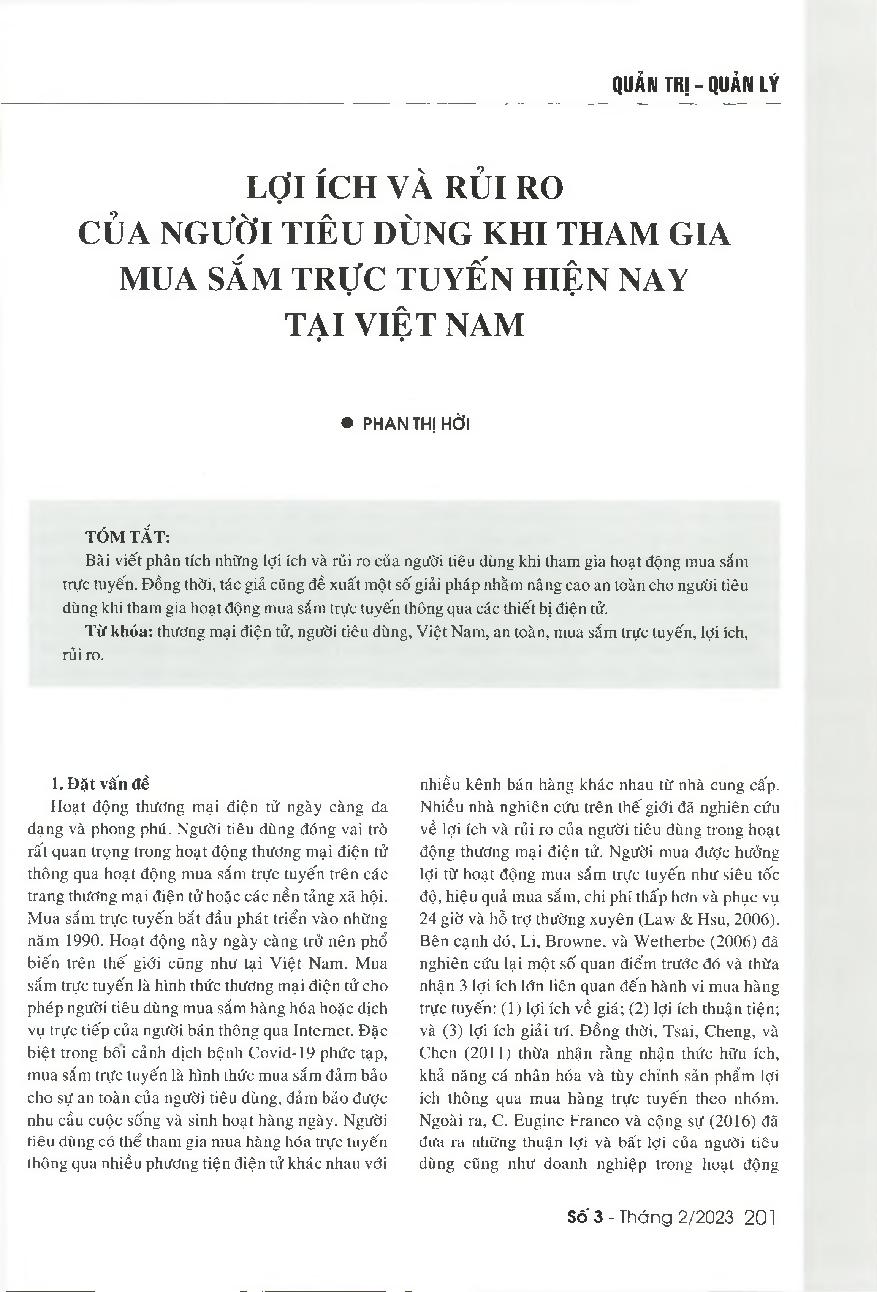 Lợi ích và rủi ro của người tiêu dùng khi tham gia mua sắm trực tuyến hiện nay tại Việt Nam = Benefits and risks facing consumers when they go shopping online in Vietnam