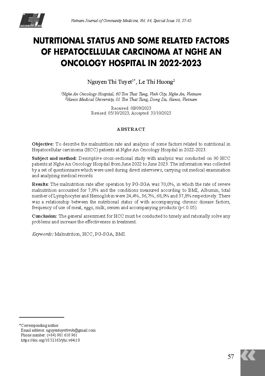 Tình trạng dinh dưỡng và một số yếu tố liên quan của bệnh nhân ung thư biểu mô tế bào gan tại Bệnh viện Ung bướu Nghệ An năm 2022 - 2023 = Nutritional status and some related factors of hepatocellular carcinoma at Nghe An Oncology Hospital in 2022-2023