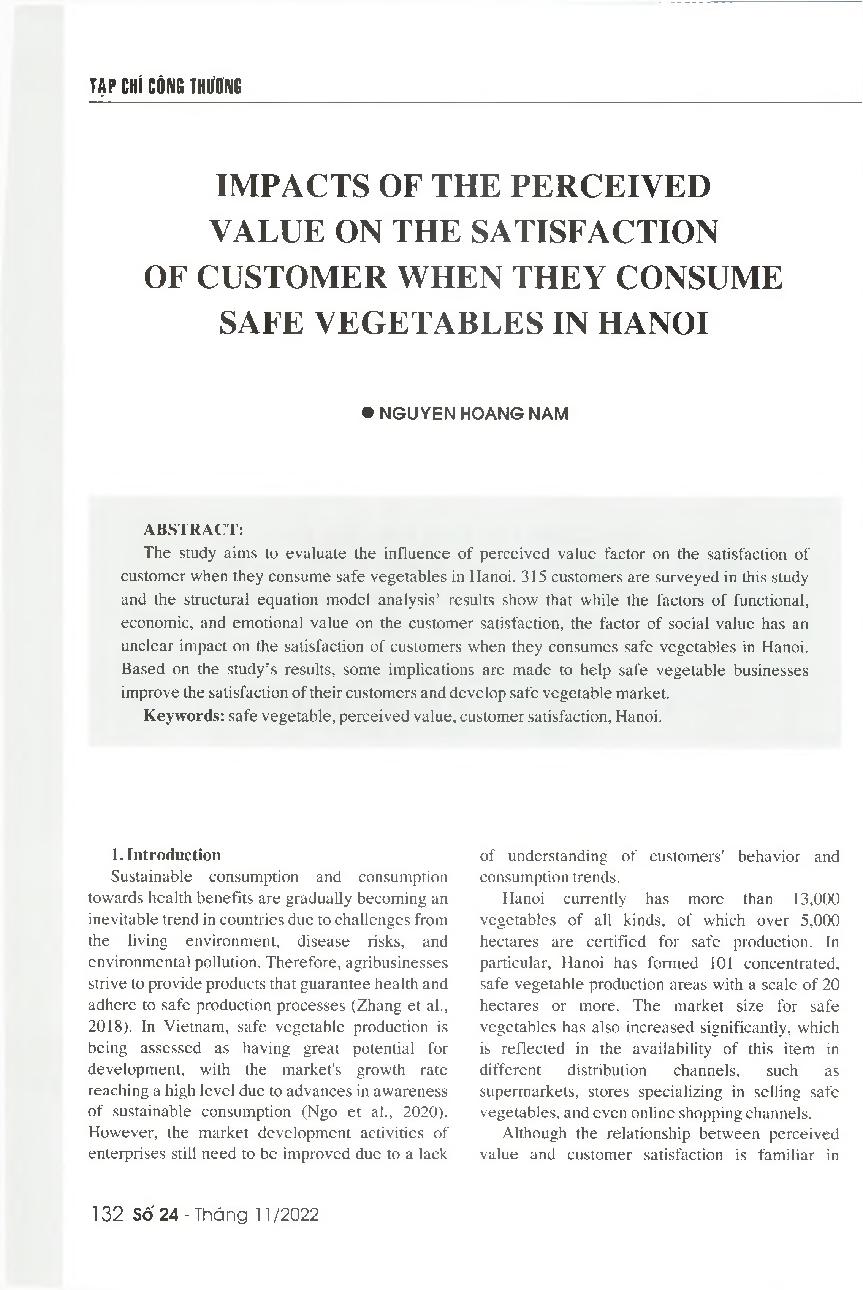 Tác động của yếu tố giá trị cảm nhận đến sự hài lòng của khách hàng khi tiêu thụ rau an toàn tại Hà Nội = Impacts of the perceived value on the satisfaction of customer when they consume safe vegetables in Hanoi