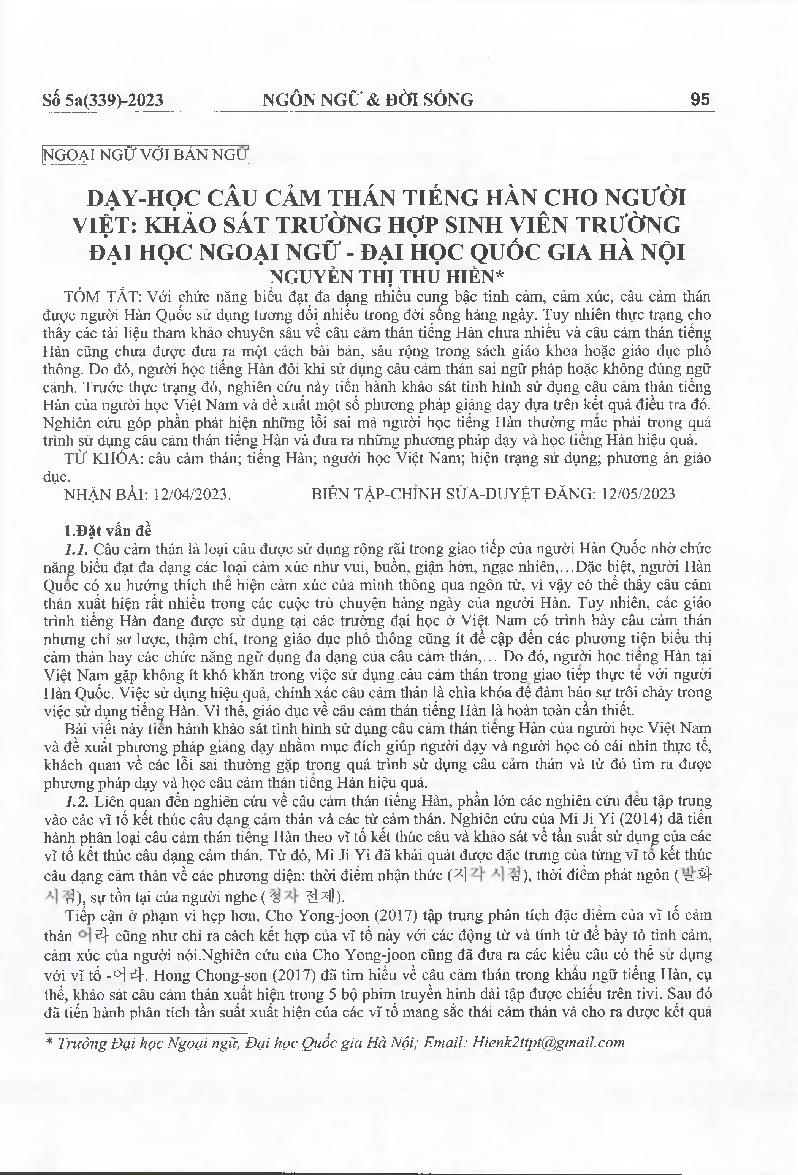 Dạy-học câu cảm thán tiếng Hàn cho người Việt: khảo sát trường hợp sinh viên trường Đại học Ngoại ngữ - Đại học Quốc gia Hà Nội = Current usage status and educational plans for exclamation sentences in Korean language for Vietnamese learners (With a focus